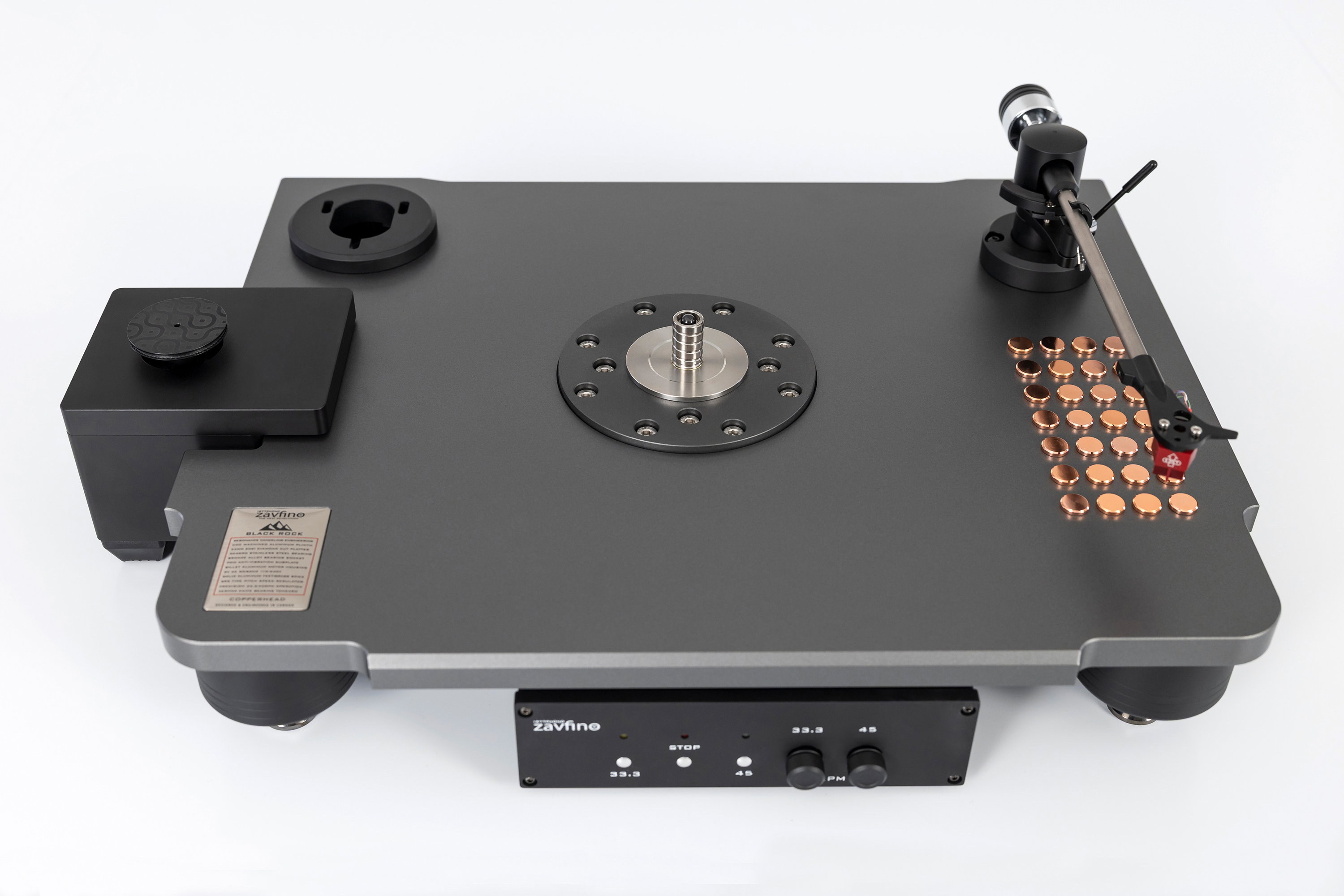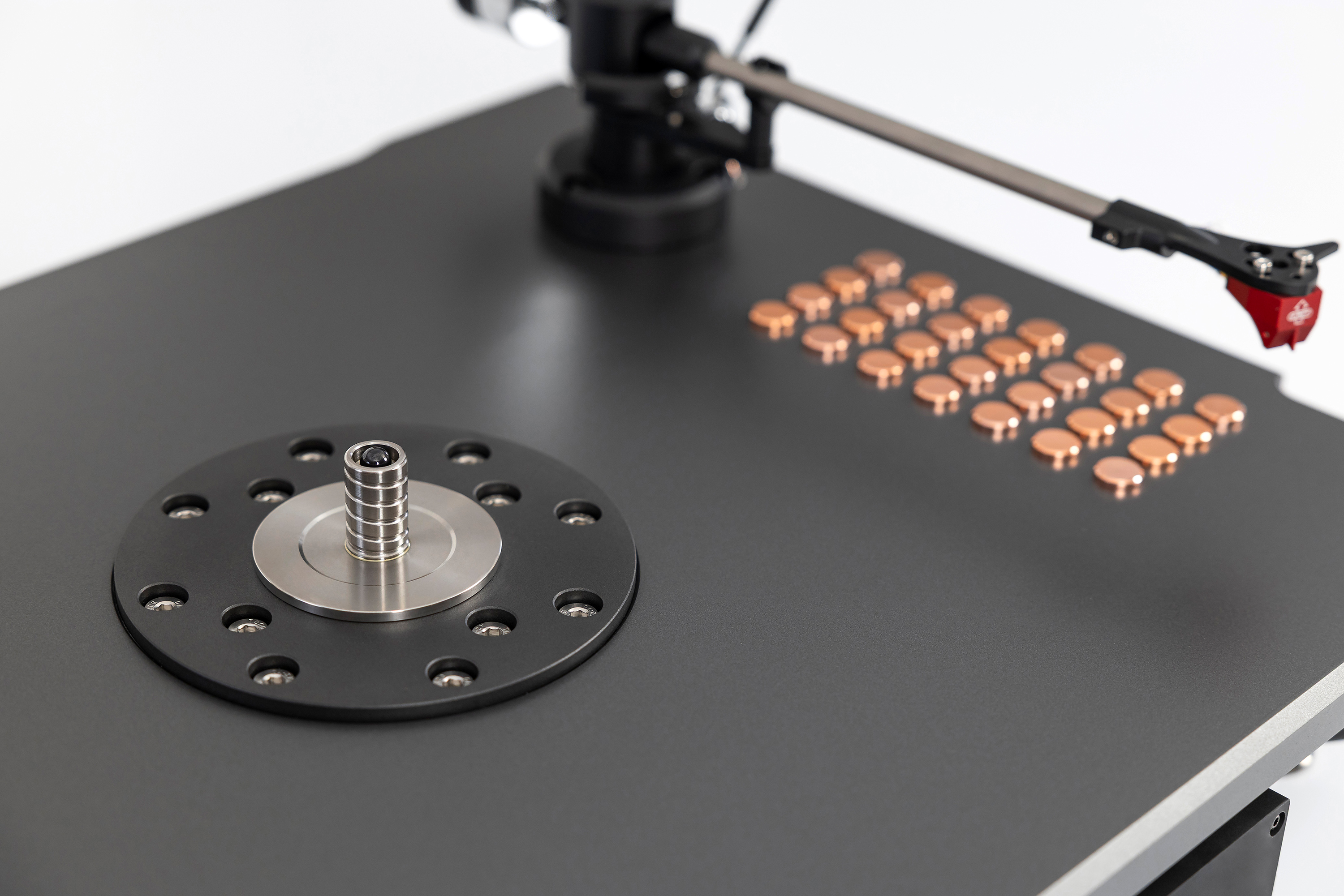 Die Basis des Plattenspielers besteht aus einer 16 mm starken Aluminiumplatte mit abgerundeten Kanten und mattschwarzer Eloxierung. Eingelassene Kupferelemente – insgesamt 28 Stück – sorgen für eine gezielte Resonanzdämpfung. Eine elegante Kupferplakette mit Modellbezeichnung ziert die Front. Optional lässt sich ein zweiter Tonarm bis zu einer Länge von 10,5 Zoll integrieren. Drei höhenverstellbare Spikes gewährleisten einen sicheren Stand und eine wirksame Entkopplung vom Untergrund.