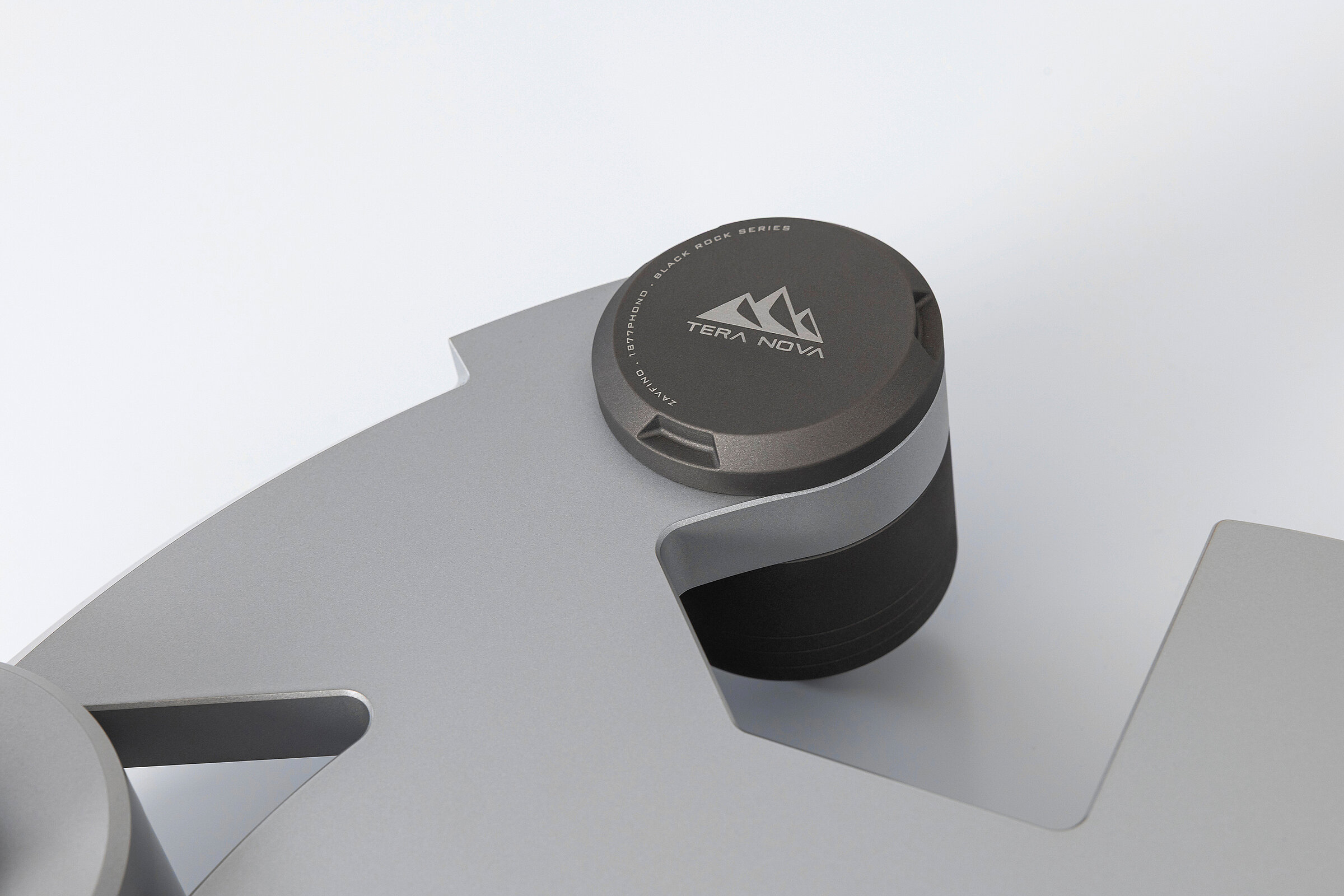 Die Zarge des Tera Nova ZV9X wird aus massivem Aluminium gefertigt und misst 470 × 420 × 70 mm bei 16,2 mm Stärke. Eine integrierte POM-Dämpfungsplatte sowie ein spezielles Kantendämpfungsdesign sorgen für eine wirkungsvolle Resonanzkontrolle. Drei höhenverstellbare Aluminiumfüße mit massiven Messingspikes gewährleisten eine stabile und vom Untergrund entkoppelte Aufstellung.