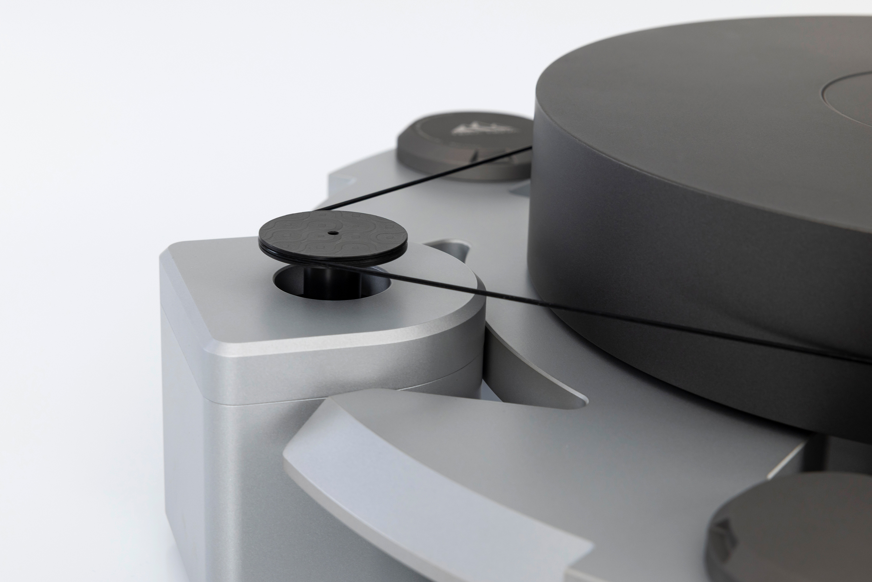 Der CNC-gefräste Plattenteller aus POM-Composite ist 60 mm stark, misst 298 mm im Durchmesser und wiegt 6,2 kg. Das invertierte Lager kombiniert eine Edelstahlachse, eine Teflon-Thrustplate, eine Bronze-Kupplung und eine Silikonring-Suspension. Diese Konstruktion minimiert Reibung und garantiert stabile Gleichlaufwerte.